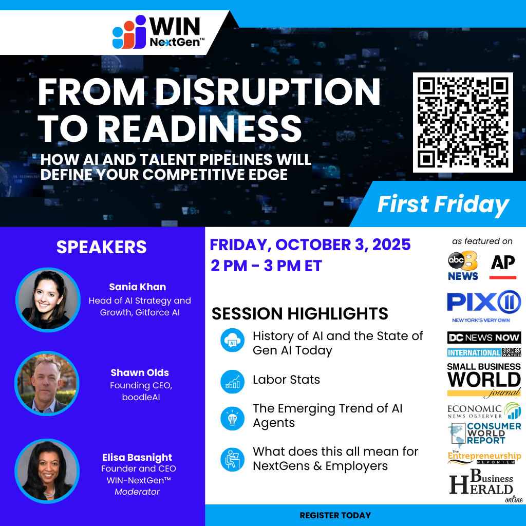 Join us for a WIN-NextGen™ First Friday session exploring how to frame and align AI integration with workforce development. Gain insights into how we got here, including recent labor statistics and economic trends. What are AI Agents, and how are they reshaping industries? Learn how to build future-ready talent pipelines and navigate the human side of AI transformation.